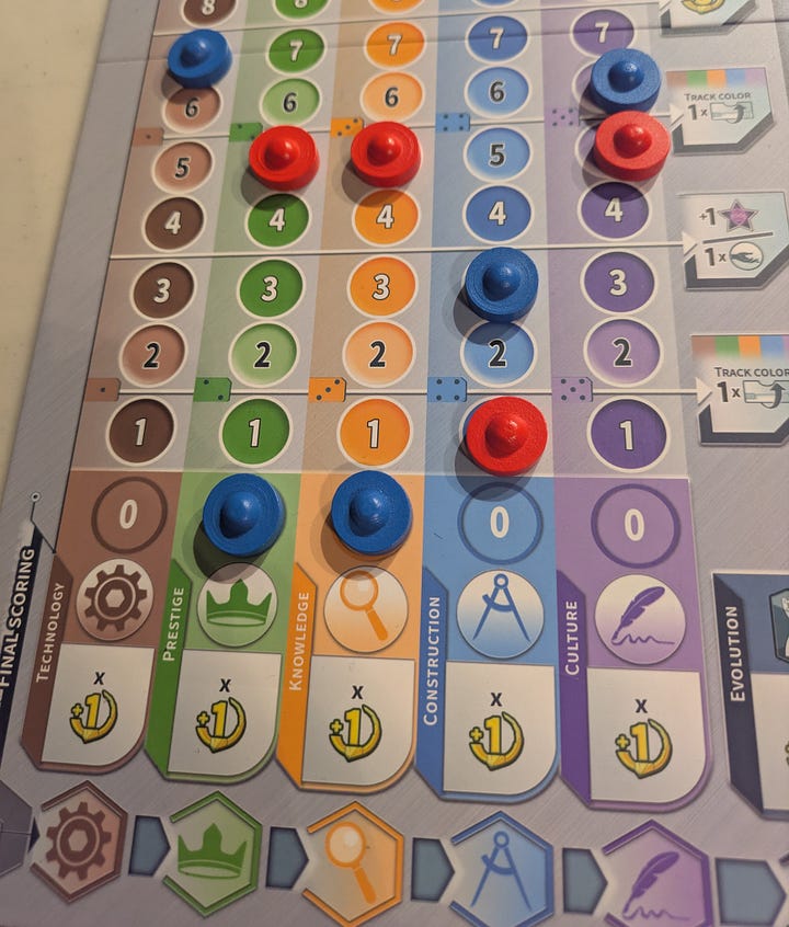 At its core, Civolution is a point salad game. You rack up points by progressing on the track, completing Era-end objectives, and interacting with building cards, income chips, and goals placed in the staging area.