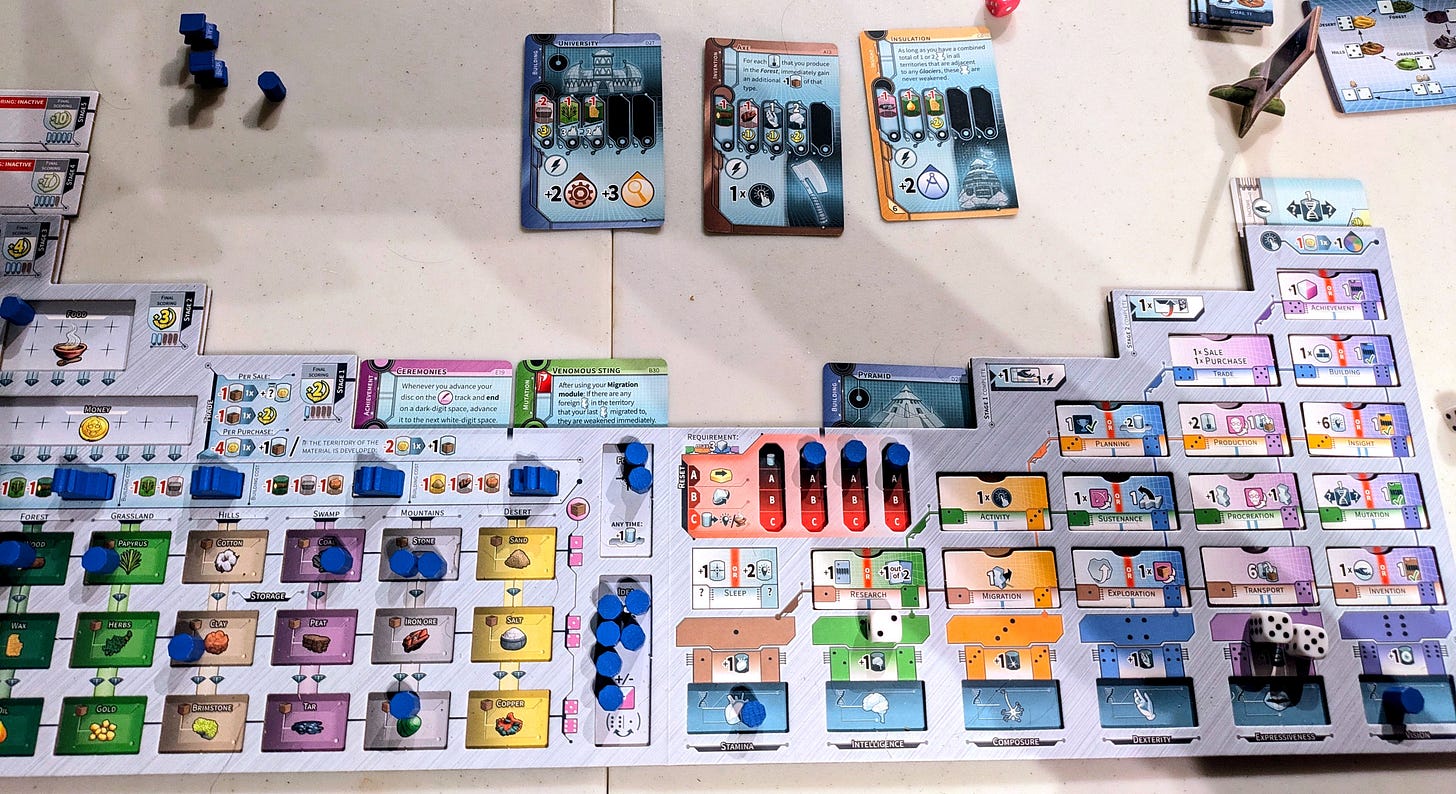 In some games, the bot focuses on procreation and migration actions, while in others, it races up the progress track, scoring points rapidly. The varying difficulty levels offer unique challenges, making each playthrough unpredictable. I haven’t yet tackled the mid or higher difficulty levels, as even the easy mode has proven frustratingly tough to beat.